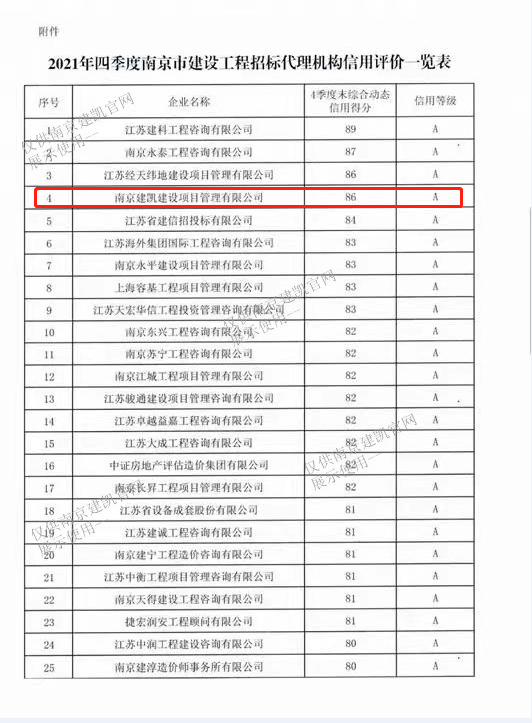 熱烈祝賀我司招標代理在“2021年四季度南京市建設工程招標代理機構信用評價”中榮獲A級。