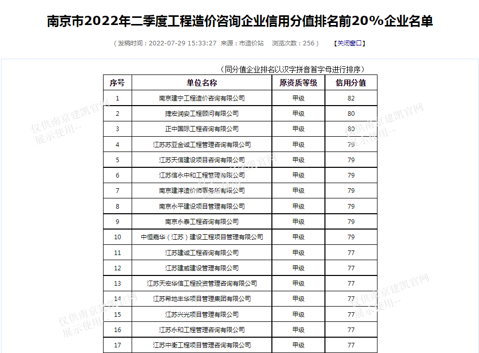 恭喜我司造價部入選“南京市2022年二季度工程造價咨詢企業(yè)信用分值排名前20%企業(yè)名單”