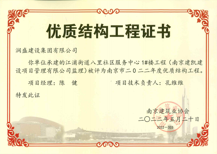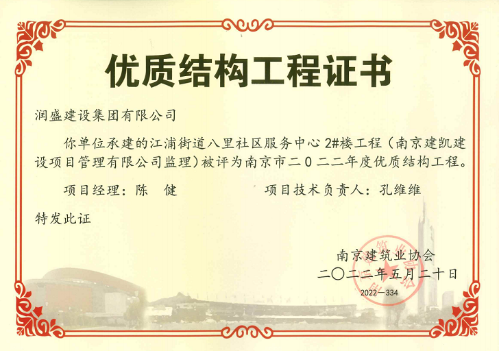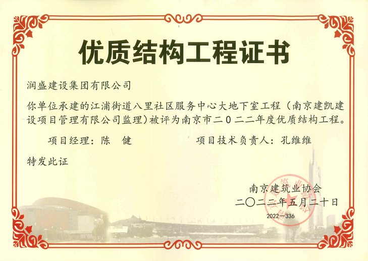 (2022年05月20日)江浦街道八里社區(qū)服務(wù)中心項目榮獲《南京市2022年度優(yōu)質(zhì)結(jié)構(gòu)工程》