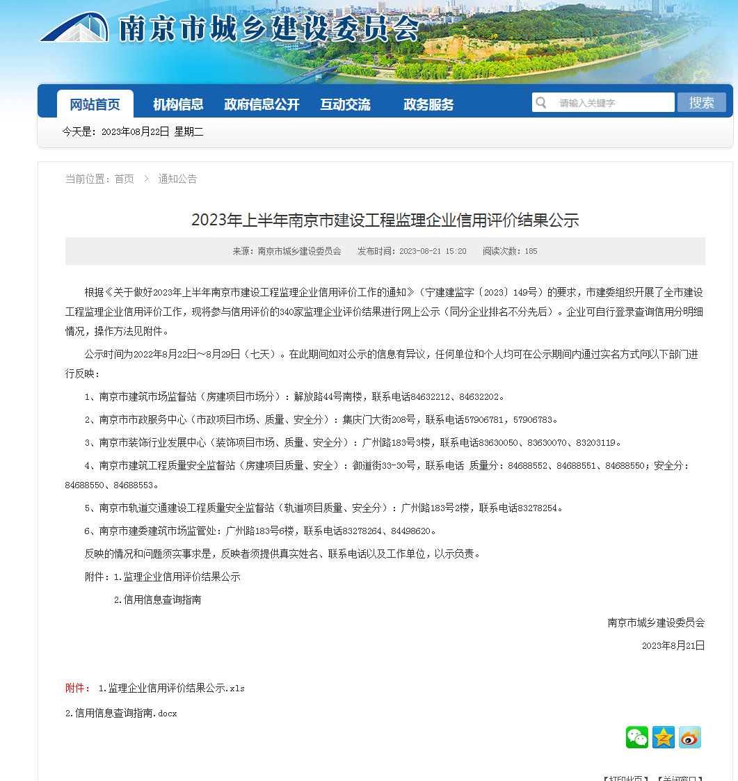 (2023年8月21日)市建委《2023年上半年南京市建設(shè)工程監(jiān)理企業(yè)信用評價結(jié)果公示》