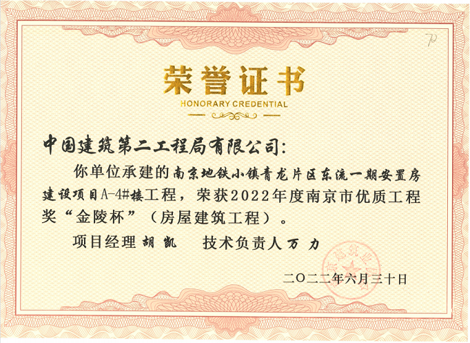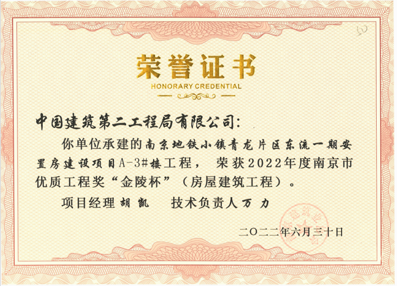 (2022年6月30日)地鐵小鎮(zhèn)青龍片區(qū)東流一期安置房建設項目A-3#樓、A-4#樓榮獲《2022年度南京市優(yōu)質(zhì)結(jié)構(gòu)“金陵杯”》獎