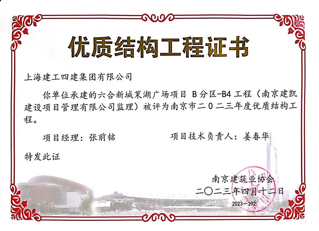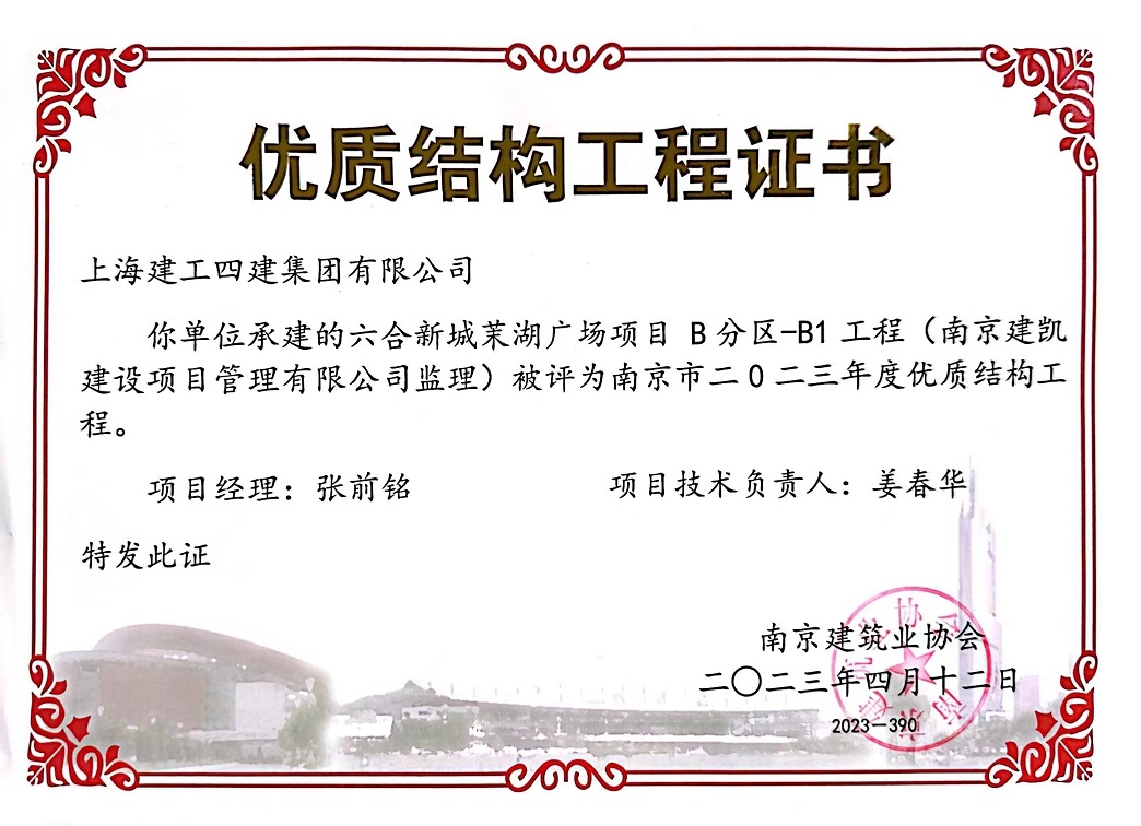 六合新城茉湖廣場(chǎng)項(xiàng)目榮獲“2023年度優(yōu)質(zhì)結(jié)構(gòu)工程”