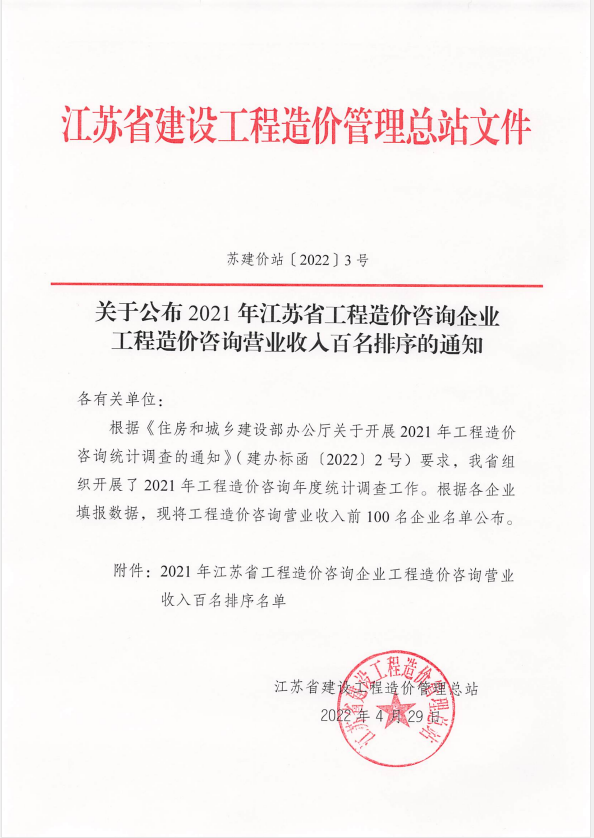 熱烈祝賀我司造價機構(gòu)進入“2021年江蘇省工程造價咨詢企業(yè)工程造價咨詢營業(yè)收入”百強名單